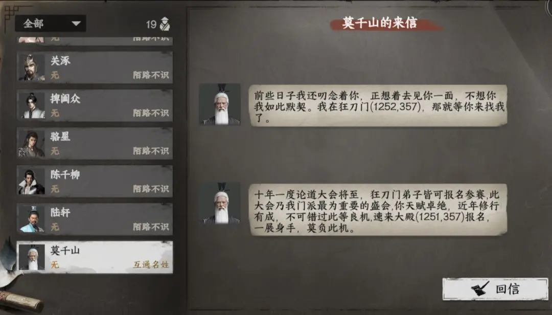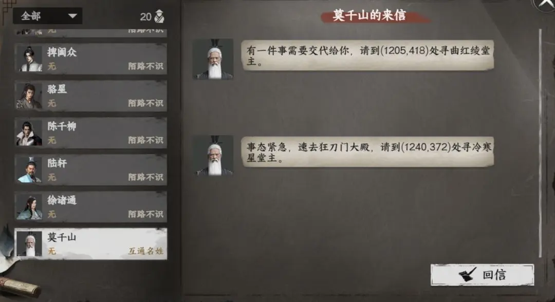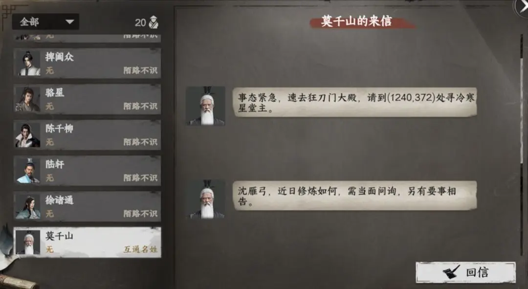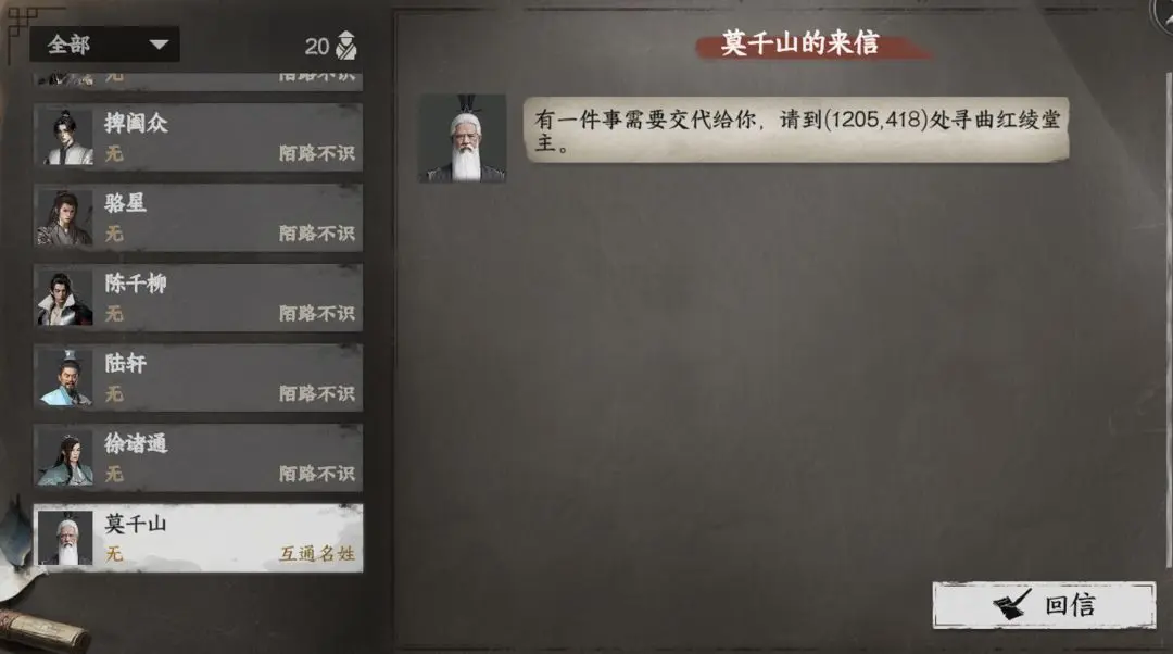 1、做悬赏任务将门派好感提升到25时收到莫千山飞鸽
