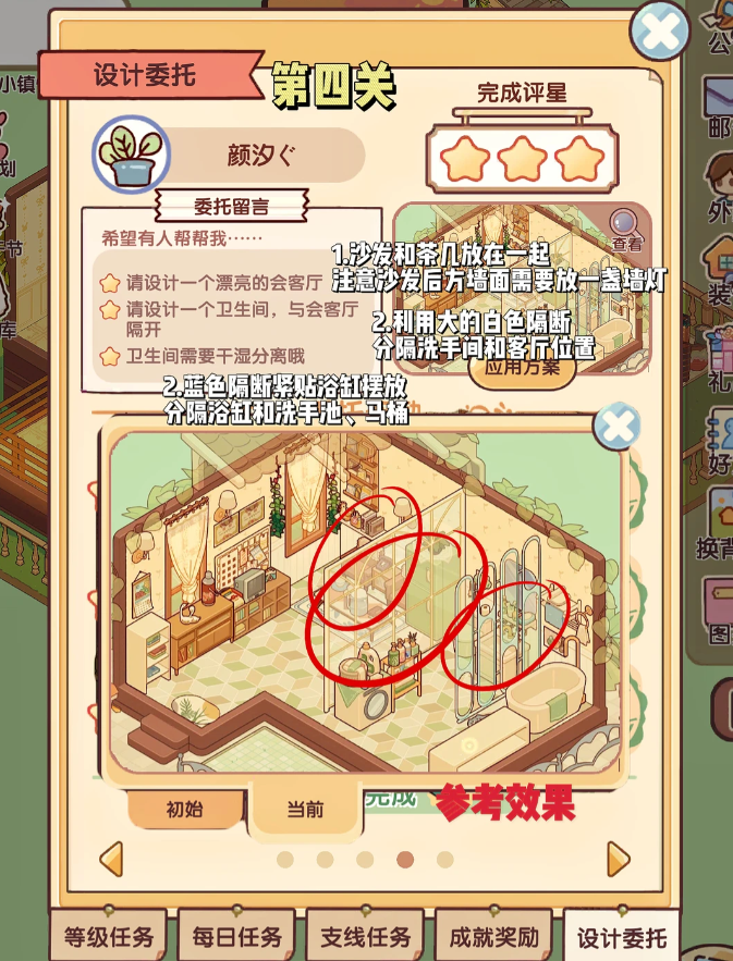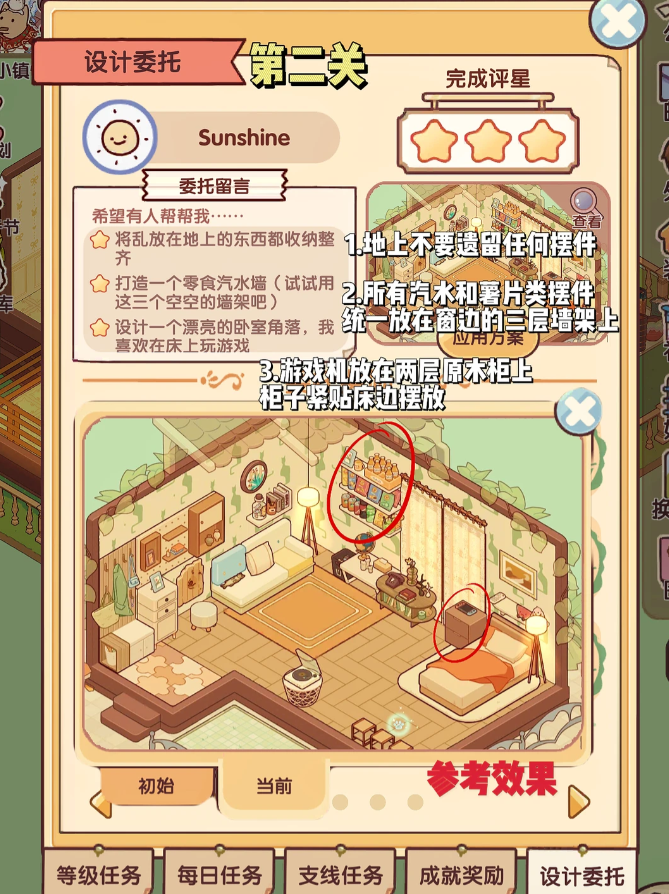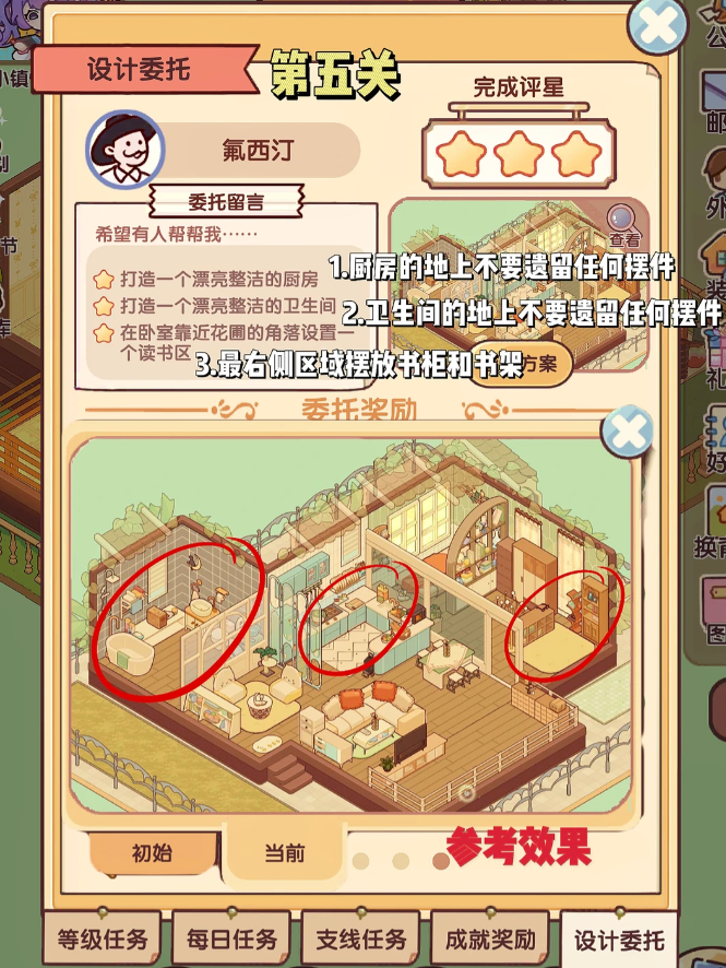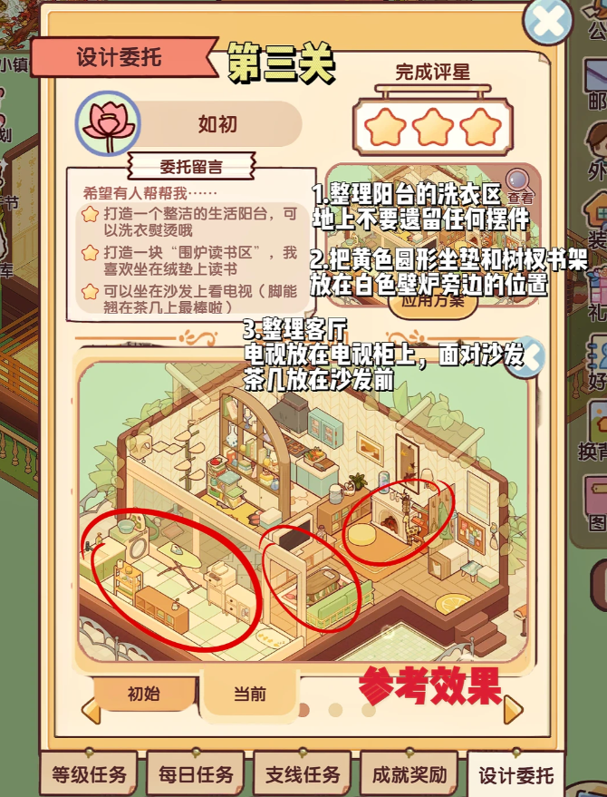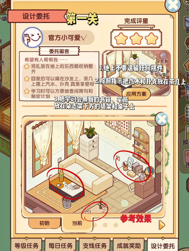 我的休闲时光设计委托玩法中,需要根据每一关中的顾客来摆放对应的家具物品,根据其留言来放置各种摆件,可根据关卡结果来对照进行完成。完整具体的全部设计委托的关卡结局内容见以下正文详情!