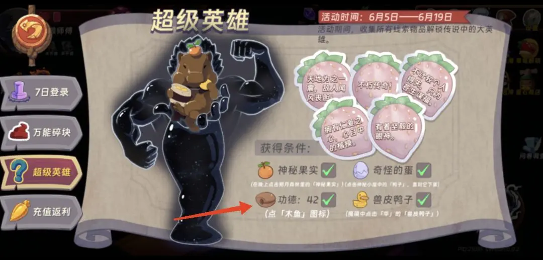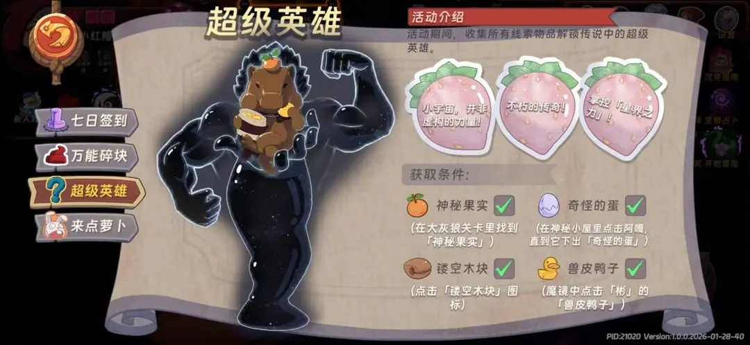汉克旅店中的隐藏角色超级英雄是一只水豚,解锁当前英雄需要在大灰狼关卡里找到神秘果实;在神秘小屋里点击阿嘎,直到它下出奇怪的蛋;点击镂空木块图标;魔镜中点击彬的兽皮鸭子。具体的获取方式流程步骤内容见以下正文内容!