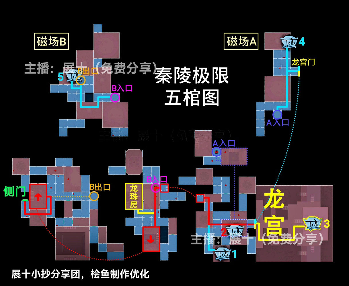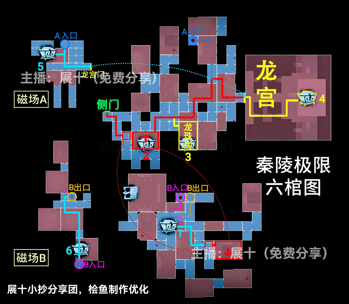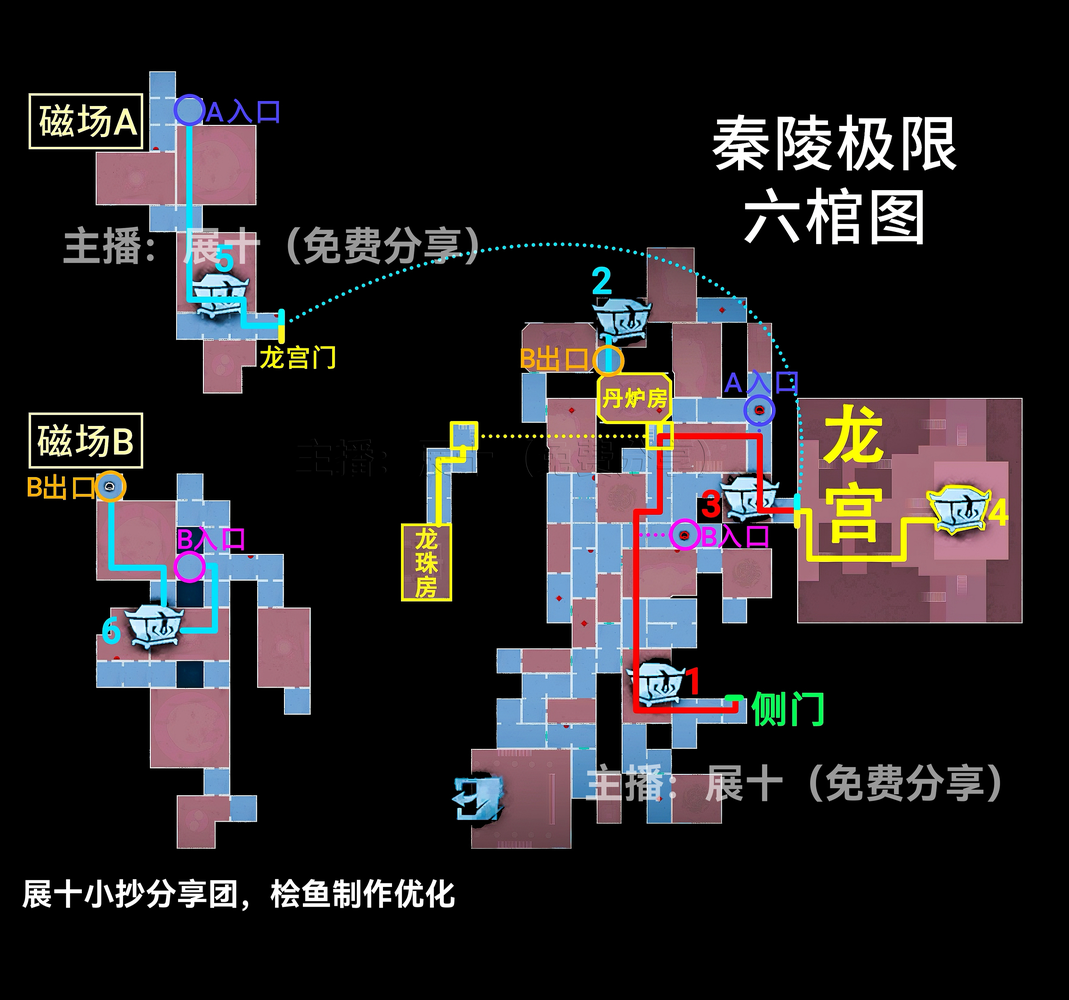 超自然行动组秦岭龙宫地图更新,其中关于极限级别且侧门在上的地图中,总共的区域可以分为上下右黑、上下左黑、上右黑、上左黑,按照图示的内容区域来进行寻找即可,各个宝箱的分布位置以及走法路线和出入口内容见下文小抄图分享!
