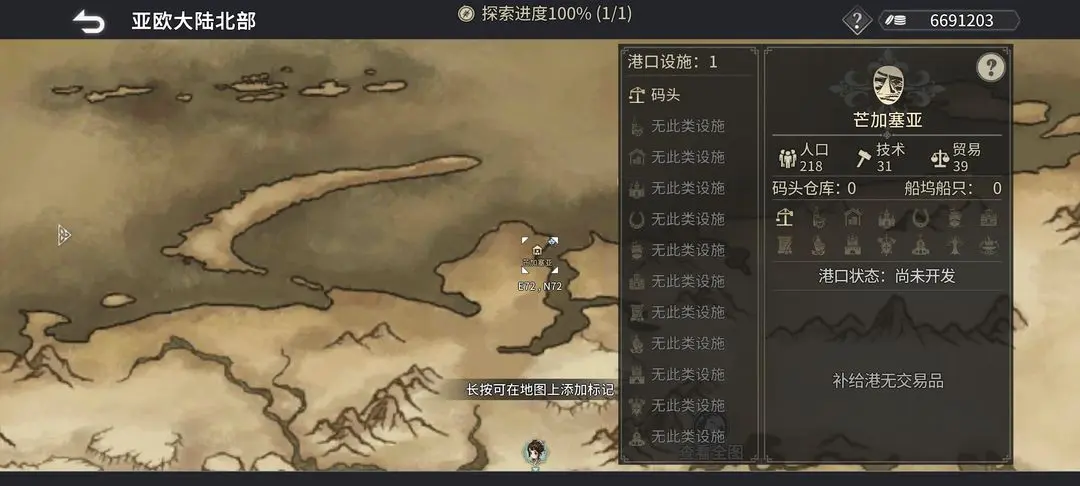 风帆纪元游戏大地图中分布着各个不同的区域,每个区域中又有小的港口,每个港口有着不一的文化和特产特殊设施内容,在亚欧大陆北部港口中的是芒加塞亚,位置坐标为E72,N72。