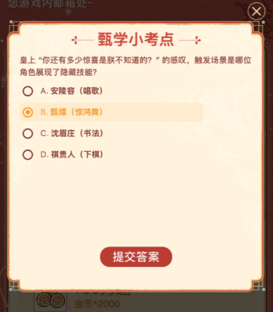 2、皇上“你还有多少惊喜是朕不知道的?"的感叹,触发场景是哪位角色展现了隐藏技能?