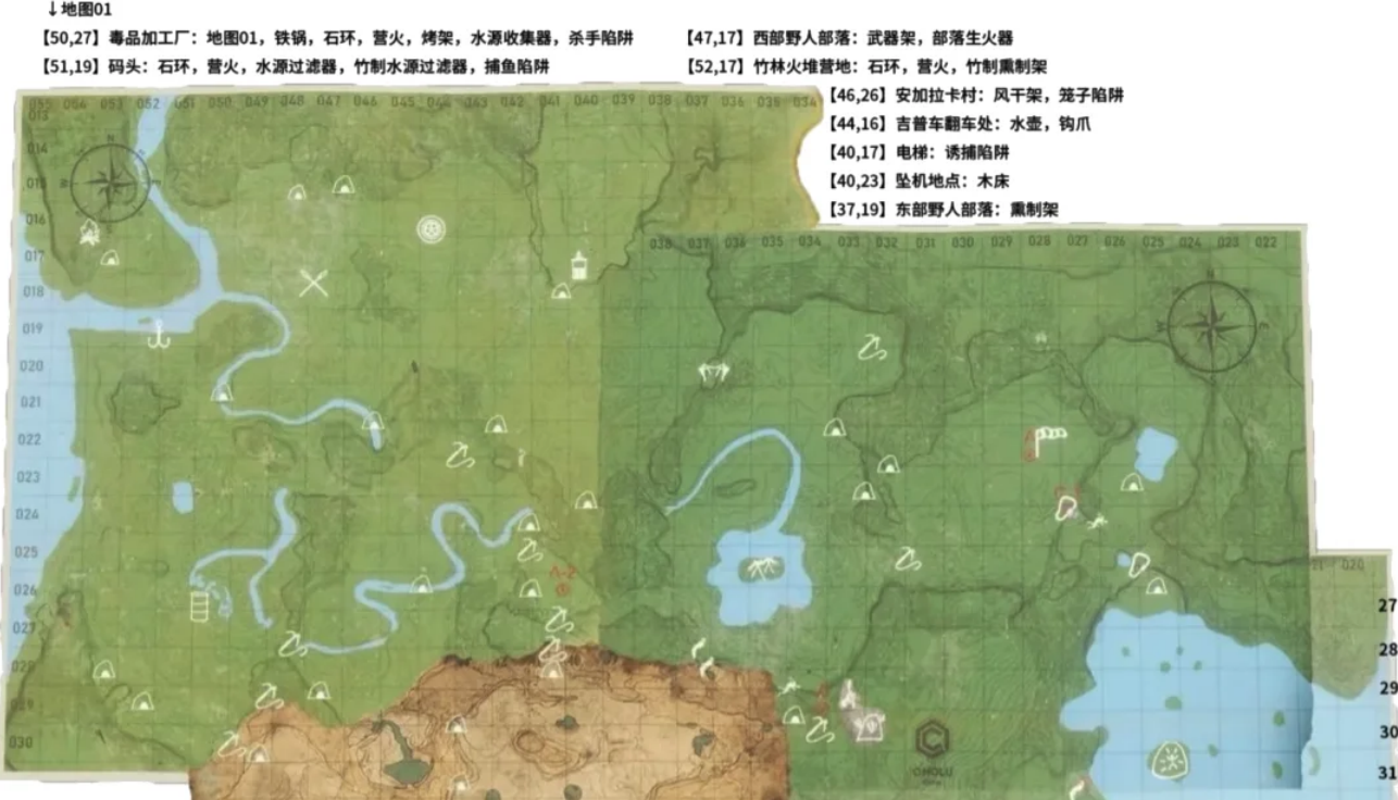 【50,27】毒品加工厂:地图01,铁锅,石环,营火,烤架,水源收集器,杀手陷阱