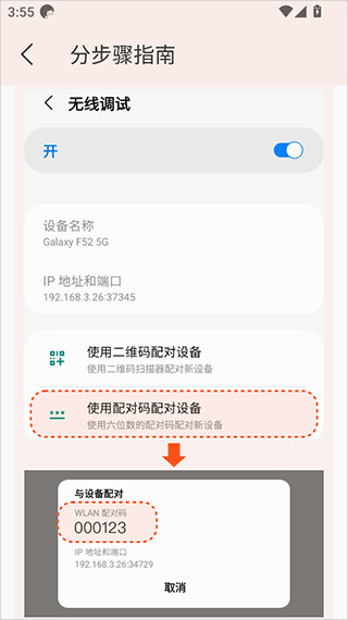 5、点击“无线调试”中的“使用配对码对设备进行配对”
