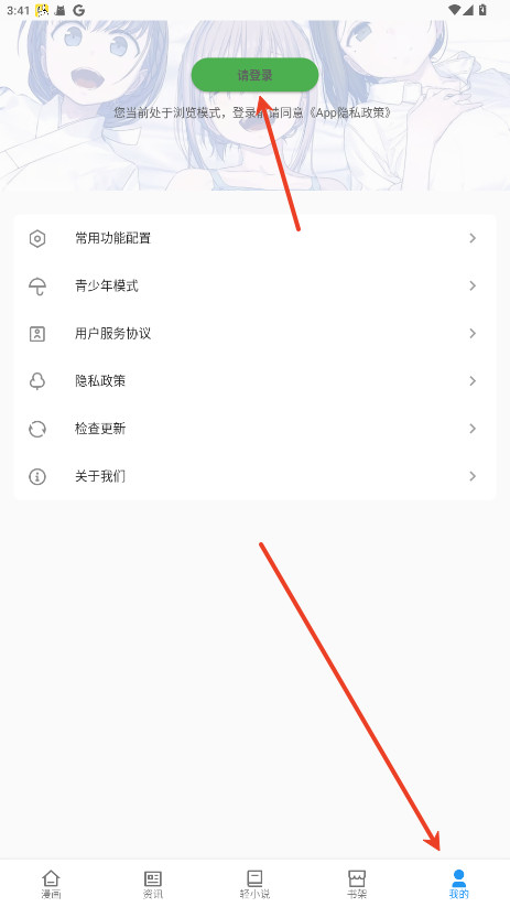 1、打开再漫画app,点击右下角我的,点击最上方的请登录